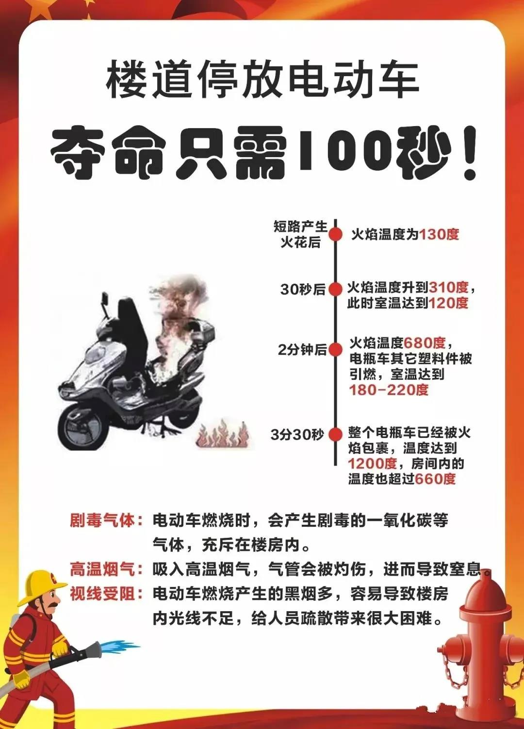 實(shí)驗(yàn)證明,電動自行車著火90秒后,溫度便可達(dá)到200度。如果把電動自行車停放在樓道等公共區(qū)域內(nèi),一旦著火,隨著火災(zāi)的迅速發(fā)展,電動車產(chǎn)生的毒氣將迅速擴(kuò)散。